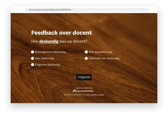 Voorbeeld: Mevrouw de Vries wil aan het einde van het semester met een enquête feedback van haar leerlingen verzamelen. Ze gebruikt een gratis SurveyMonkey-account, kiest een vooraf ingestelde enquête met een hoog contrast, schakelt over naar een vriendelijk Sans-Serif-lettertype, voegt het schoollogo toe als kleine header en verstuurt periodiek een poolshoogte-enquête naar haar klas: geen ontwerpvaardigheden nodig. Ga gratis aan de slag.